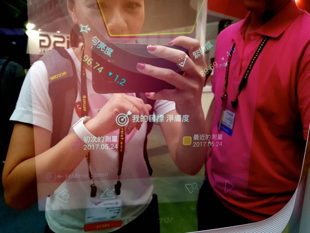 有著 14 吋大小的 Hi Mirror 魔鏡主要是透過上方的高解析度相機來為我們肌膚進行測試,測試內容包括有黑眼圈、皺紋、雀斑、紅斑等等,主要是透過 WiFi 來將個人肌膚資訊傳遞至 Android / iOS 行動裝置之中,讓自己能夠透過紀錄來觀察肌膚的變化。