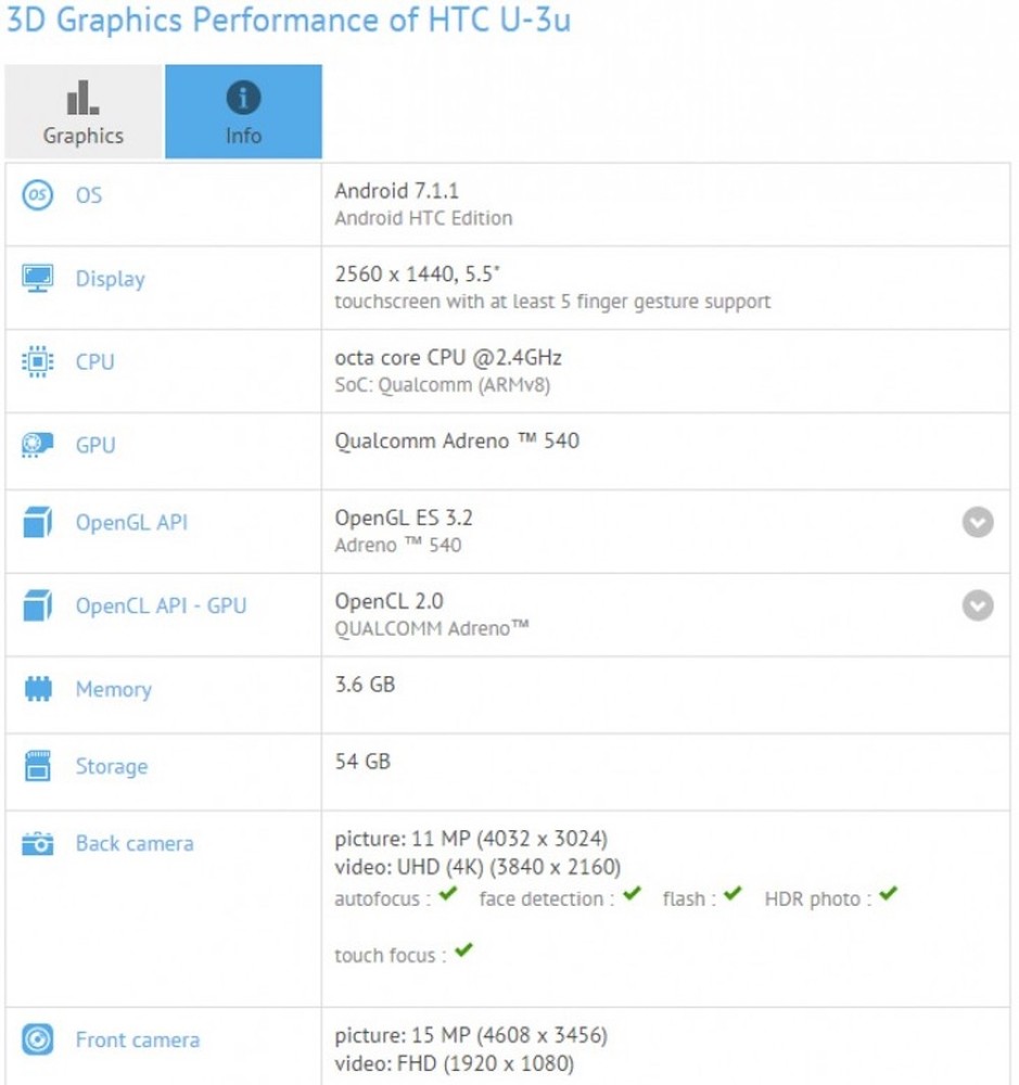 根據國外知名跑分網站 Geekbench 的資訊表示,HTC U 將會搭載一個 5.5 吋 2K 解析度的螢幕,從使用的 Adreno 540 顯示晶片來看,處理器確定會是高通的 Snapdragon 835 處理器。相機模組方面,HTC U 將採用 1200 萬畫素主鏡頭以及 1600 萬畫素自拍鏡頭,但目前還無法確認第三代 HTC UltraPixel 會應用在哪個鏡頭上。