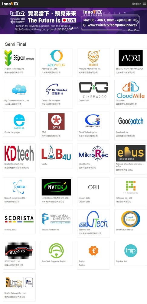 TCA表示,獲選進入InnoVEX Pitch複賽的29組海內外新創團隊包括有:3egreen technology inc. (展綠科技)、Addweup Co., Ltd. (艾威奧普)、Amaryllo International Inc. (愛瑪麗歐)、BEIJING AVORI TECHNOLOGY (北京希澈科技)、Big Data enterprise Co . , ltd (大數據企業)、Cerebra Technologies (宏腦科技)、Cinema2Go、CloudMile (萬里雲互聯網路)、Cookie Languages、DT42 (灼灼科技)、Gintel Technology Inc. (禾生科技)、Goodpatch.Inc (谷德帕奇設計)、Kineto Drive Tech. Inc. (肯尼拓驅動科技)、Lab4U、MikroRec Inc. (邁睿科生技)、National Chiao Tung University – e-Bus (國立交通大學 e-Bus)、Nestech Corporation Ltd. (聯騏技研)、NVTEK ELECTRONIC CO.,LTD. (奈特視訊科技)、Origami Labs、Pi Square Co., Ltd. (湃思)、Scorista, LLC、Security Platform Inc.、SEDA G-Tech (世大福智科技)、SmartFuture Pte Ltd 、SWISYS CO., Ltd (瑞麗系統科技)、Sybo Tech Singapore Pte Ltd、Toii Inc.、Triip Pte. Ltd、UnaBiz Network Co., Ltd. (優納比網路)等,而詳細入圍廠商名單與展出內容,可參考InnoVEX官網,網址為http://innovex.computex.biz。