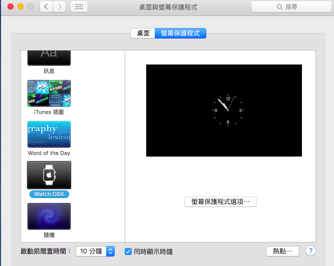Step 3. 進入「螢幕保護程式」分頁中,是不是就有看到琳琅滿目的類別?! 往下拉找到「Watch OSX」。