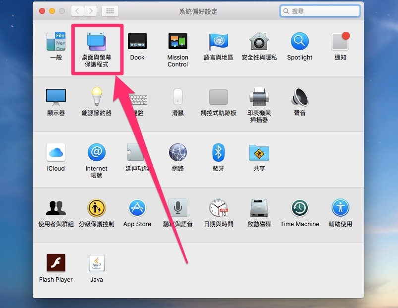 Step 2. 解壓縮完下載的檔案後,點選桌面左上角「 」 選擇「系統偏好設定」 >>> 「桌面與螢幕保護程式」。