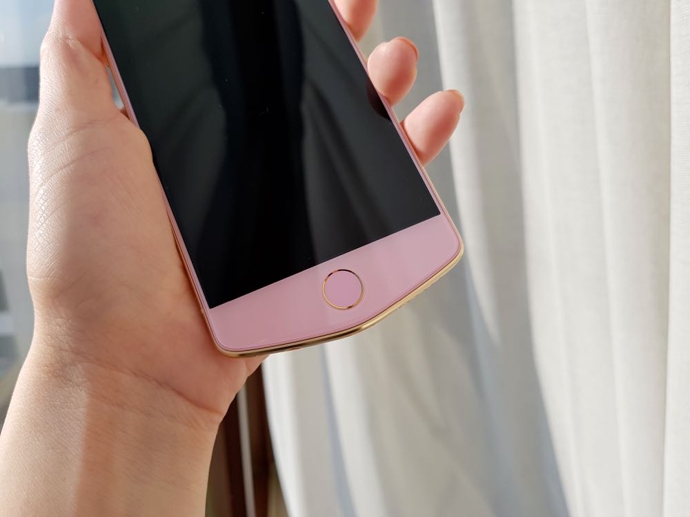 在粉紅機身上印著小兔的身影,機身上的粉紅色和櫻花粉 M8 一樣,不過在側邊與指紋辨識處使用了金色來突顯其特別身份。