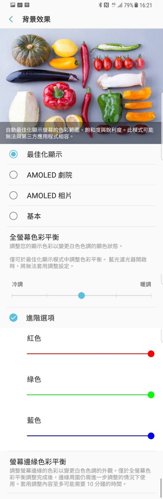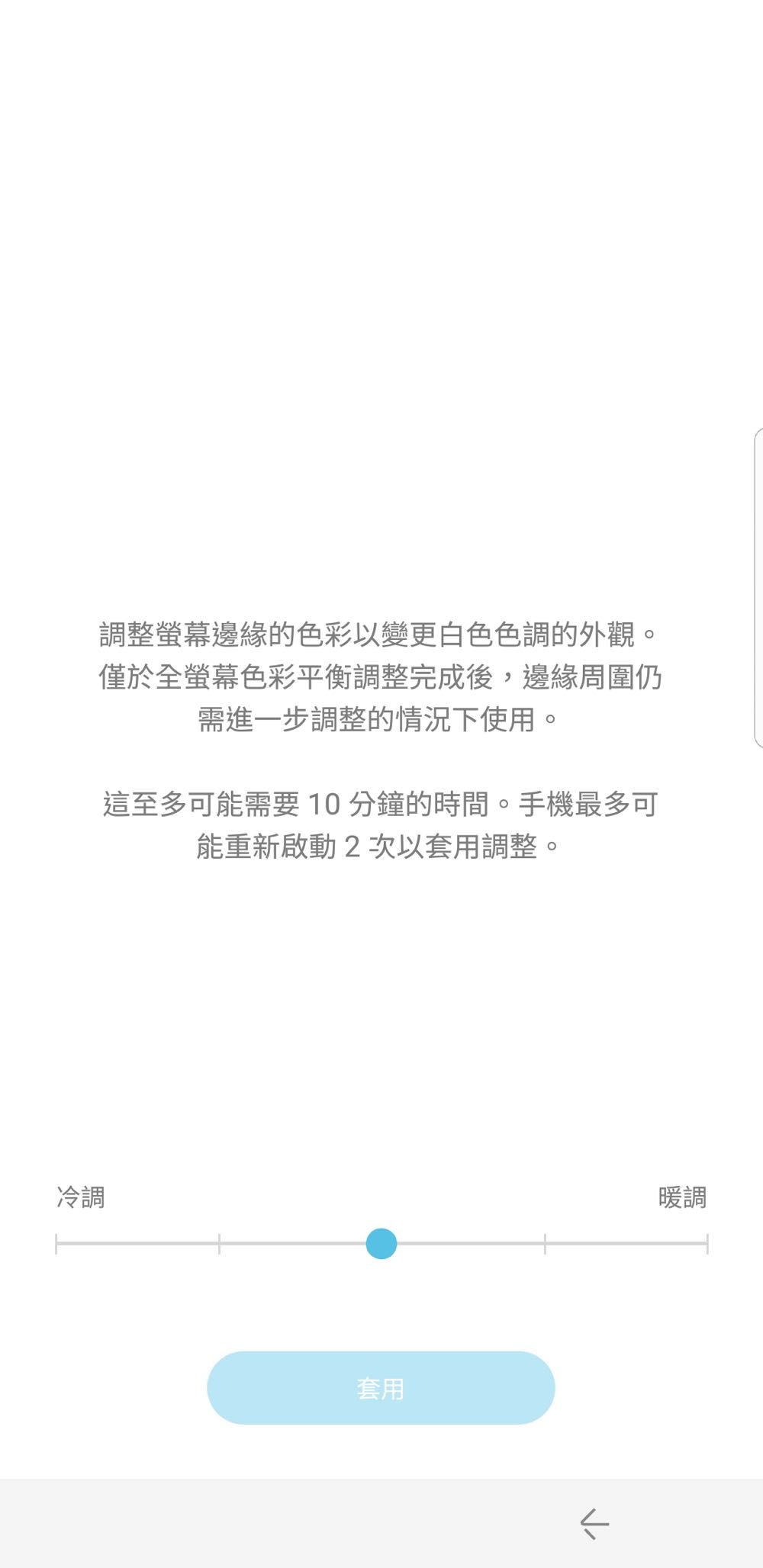 這邊三星已經提供了針對螢幕與邊緣的調校更新,也就是說若是覺得自己的螢幕偏紅到不適應,可以透過「全螢幕色彩平衡」來調整; 若是覺得好像是螢幕邊緣偏紅,那麼就能從「螢幕邊緣色彩平衡」