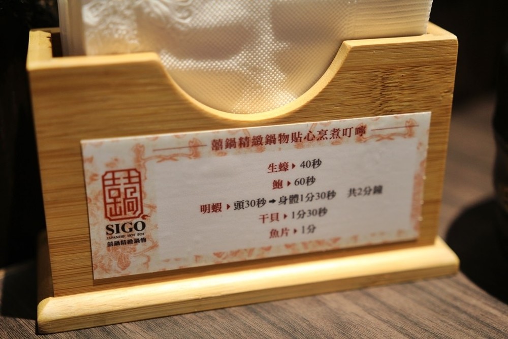 店家很貼心的在面紙盒上標示烹煮叮嚀,有關於海鮮的烹煮時間,大家可以參考看看唷