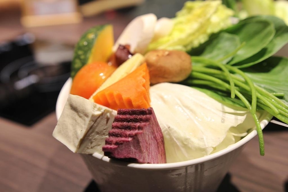 菜盤的部分,滿滿的蔬菜,幾乎不見火鍋料的蹤影,有高麗菜、青江菜、水蓮、木耳、精靈菇等,還有手工豆皮,及來自青農的栗子南瓜與紫地瓜,大推這兩樣,不小心忘記煮到最後,竟然不會整個爛掉化開,很耐煮耶,吃起來口感超綿密,第一次吃到栗子味道的南瓜,真的超特別的