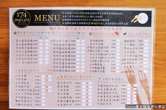 咖啡廳有提供早午餐、義大利麵、焗烤、咖啡茶飲等,飲料價位在100~150元,餐點在250~290元之間