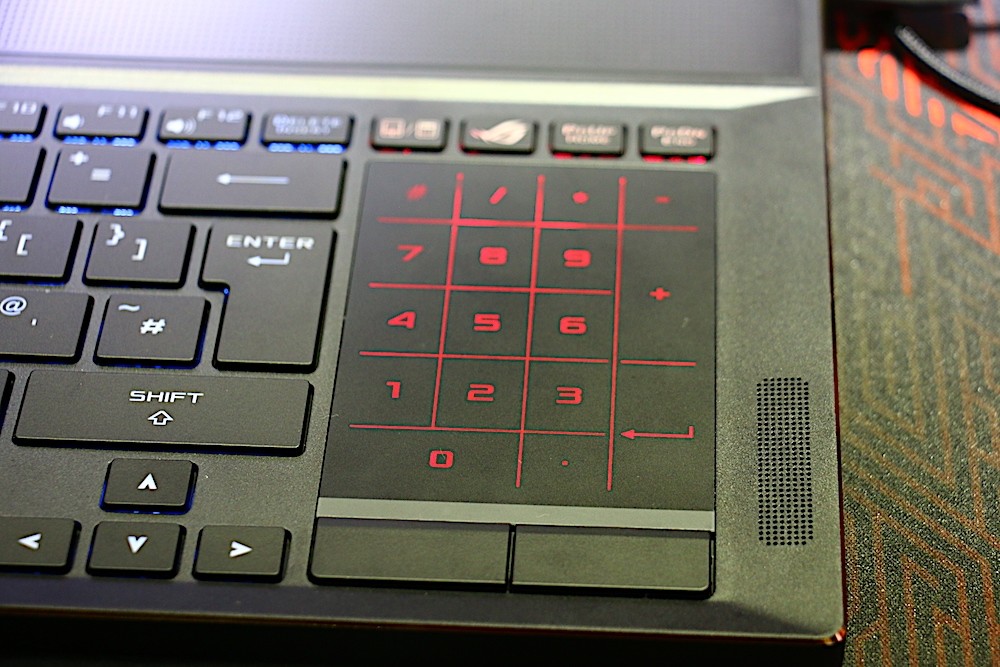 除了 RGB 色彩變換之外,ROG Zephyrus 鍵盤另一個特色就是位於右側的黑色板件,這個黑色板件具備兩種功能,當上方沒有任何圖示時可以用來控制滑鼠的觸控板,按下鍵盤上的切換鍵後就會出現數字鍵盤,讓用戶能依照自己的需求快速切換。