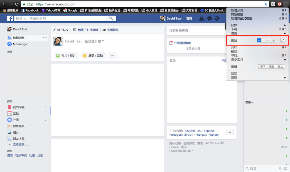 看完方法一的朋友或許會問,如果我不是 Facebook 粉絲團的管理者,卻還是遇到 Facebook 開啟失敗並造成 Chrome 異常關閉的狀況,那該怎麼辦呢?根據網路資料表示,非 Facebook 粉絲團管理者若是遇到上述異常狀況,可以嘗試將 Chrome 的畫面比例適時縮小的方法,只要透過鍵盤上的 Ctrl+滑鼠滾輪上下滾動,或是從 Chrome 的設定頁面中去調整畫面比例,並將畫面比例調整到 100% (含) 以下也可以減緩上述異常狀況發生的機率,讓 Facebook 在 Chrome 中正常開啟。