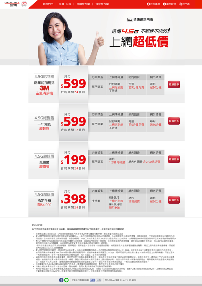 不過大家要注意一下,遠傳這個活動只有網路門市才有,跑實體門市是找不到的啦!簡單來說在活動期間,只要你是符合新申辦/攜碼並申辦兩年合約的「$599 飆速吃到飽」,就是爽爽「吃到飽」、「不限速的超快 4.5G」外加 3M 空氣清淨機一台,這對小資族或租屋族來說真是太適合了,推薦給大家囉!