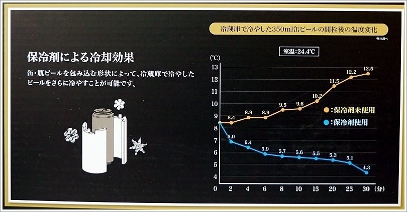 ▼在室溫24.4℃環境下,使用保冷劑與未使用時,啤酒溫度的變化隨著時間拉長差異則會越來越大!