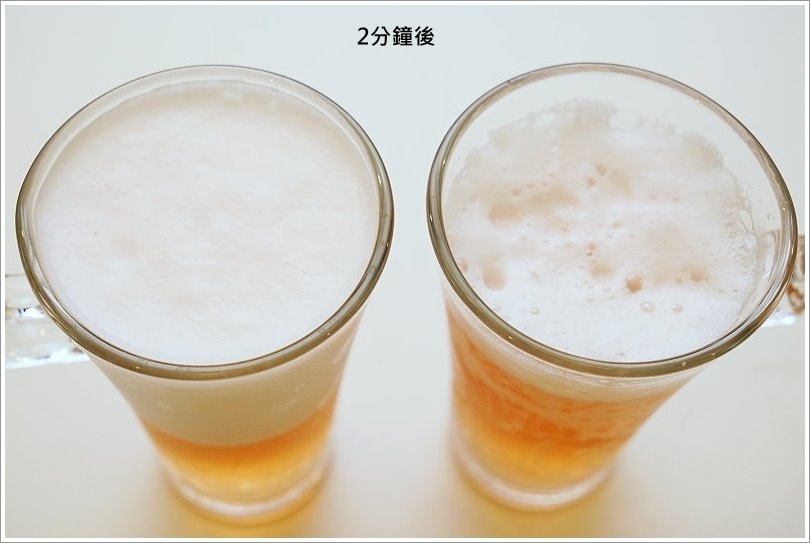 ▼靜置兩分鐘後,啤酒泡泡機倒出的泡沫還是差不多細膩,不會因為久置而快速消失~一般手倒的啤酒泡沫很快就消失殆盡,喝起來也更容易喝到啤酒的酸苦味!