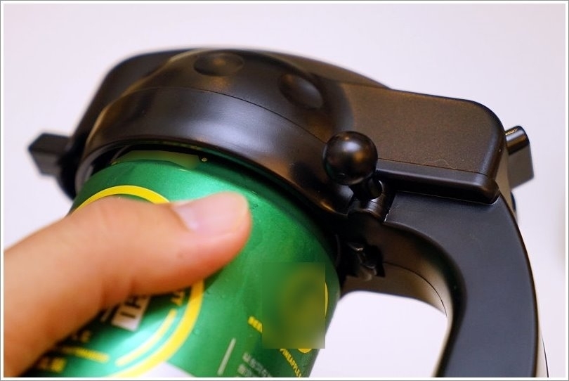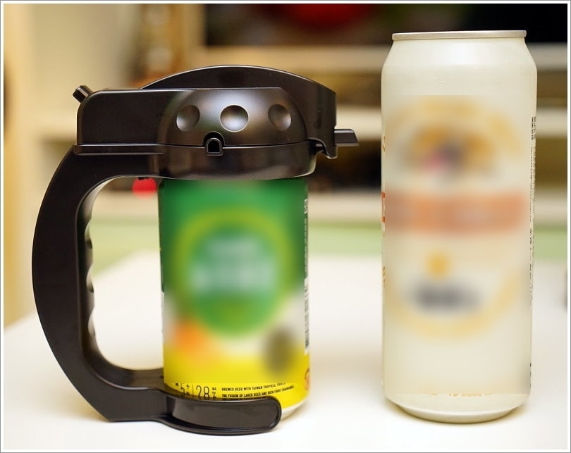 ▼透過這個卡榫設計,可牢固的將手持啤酒泡泡機與罐裝啤酒結合,圓形手把功能是取出啤酒時往前撥即可鬆開罐子!