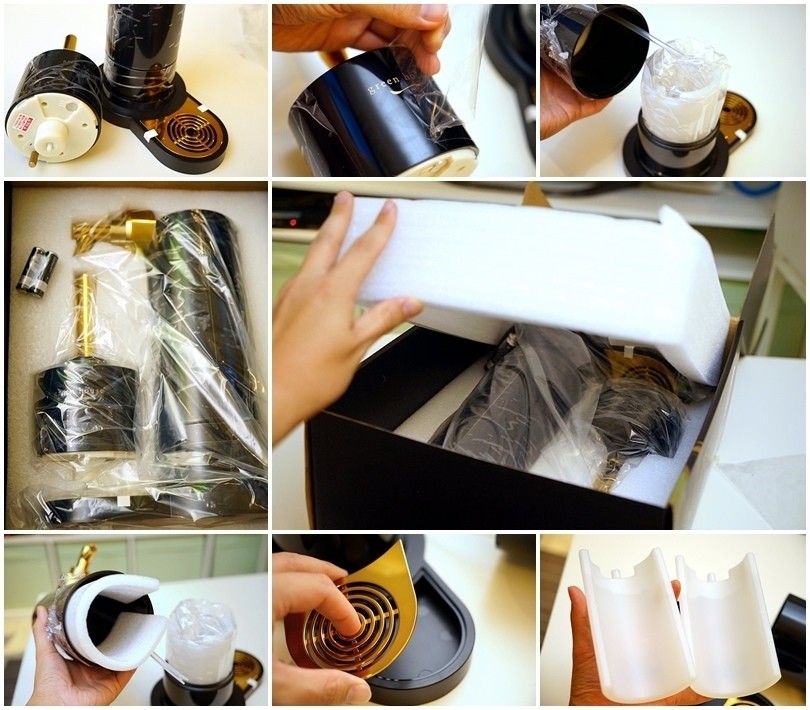 ▼手持玩樂型的啤酒泡泡機配料更少了~採用的同樣是黑金色系的高質感搭配,LOGO則位於手持握把的部位!裝好電池後即可將主機及手持握把結合在一起~話說這台手持型啤酒泡泡機只有140g,一整個超輕巧,外出攜帶也不會造成負擔!