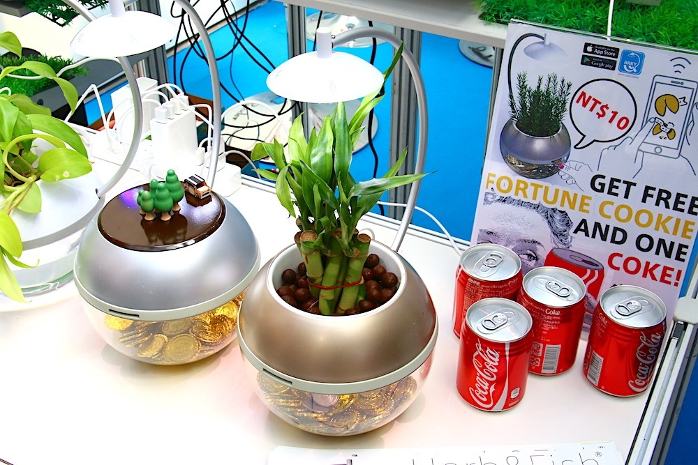 香草與魚是一款導入魚菜共生概念的辦公室療癒小物,這款產品自結束 Kickstarter 上的募資,並開始量產上市之後,就在全球各地掀起一股小熱潮。而在 COMPUTEX 2017 中,桃子良品在現場除了展出魚菜共生版本的第一代香草與魚外,還一同展示了將底層的水、魚全部移除,並在上蓋側邊開了一個能讓硬幣投入開口的第二代香草與魚,搭配對應的 App 一起使用,讓整個香草與魚搖身一變,變成一個既能療癒且又具備存錢功能的療癒存錢筒。