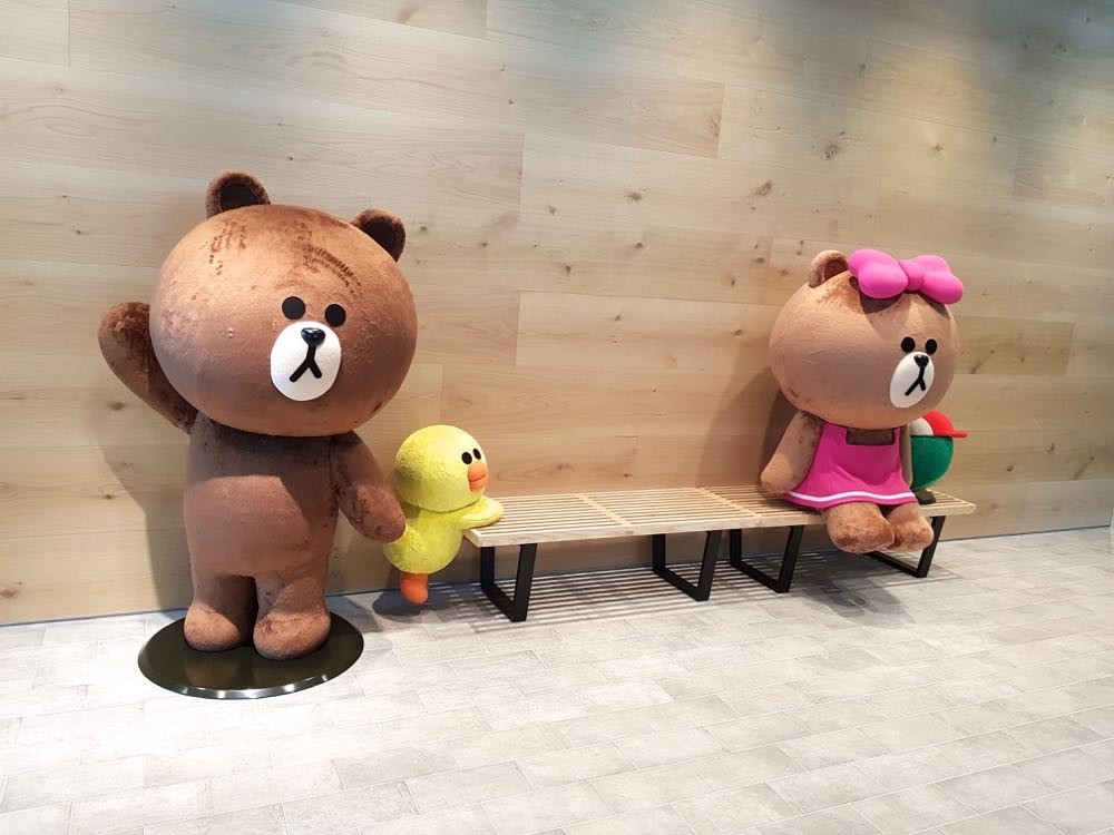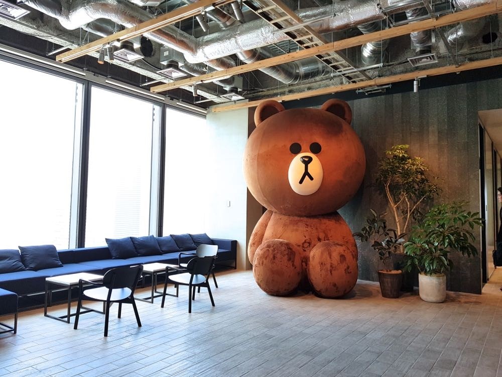 除了讓大家更加了解 WAVE 的「跨國計畫」外,事實上位於新宿站旁的辦公大樓也是 LINE 於今年 3 月遷入的新辦公大樓,在接待區中我們可以看到從一進來便有著和接待人員一樣穿著制服的可愛 Cony 在迎接著我們,一旁更有和台灣辦公室一樣的巨型熊大坐鎮,而穿梭在樓層之中更能看見許多角色巧妙的出現在任何一個角落,25 樓的高樓也有著明亮的光線與許多溫暖休息座位,讓員工或是訪客都能在這邊擁有片刻的休憩。