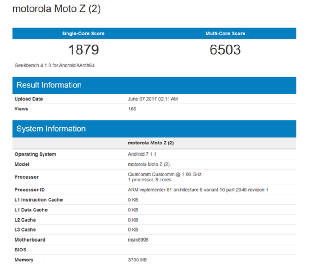 根據知名跑分網站 GeekBench 資料庫中的資訊指出,Moto Z2 預計會採用高通 Snapdragon 835 處理器,搭配 4GB RAM 以及可能的 64GB ROM,運行的系統為 Android 7.1.1。從實測出來的成績來看,Moto Z2 在單核成績為 1879 分、多核成績為 6503 分,雖然成績比起大多搭載高通 Snapdragon 835 處理器的手機來說相對較低,但有可能是因為工程機尚未完成調教的關係才會使得跑分成績明顯較低,市售版的跑分成績應該會明顯改善。