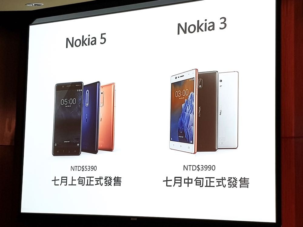 Nokia 3 共有黑、銅兩色,建議售價為 NT$3,990 元,7 月 6 日起至 14 日於遠傳電信網路門市等開放預購,7 月 15 日開始出貨。Nokia 5 共有藍、銅兩色,空機售價為 NT$5,390 元,7 月 1 日起在遠傳電信與各大經銷店開賣。