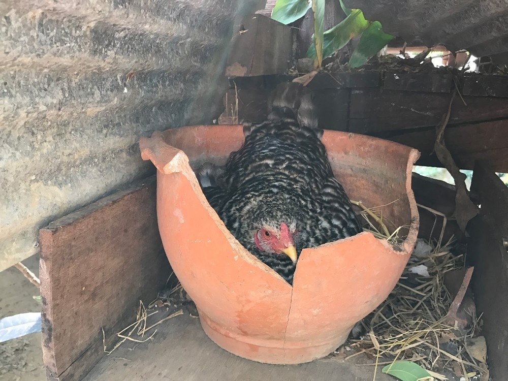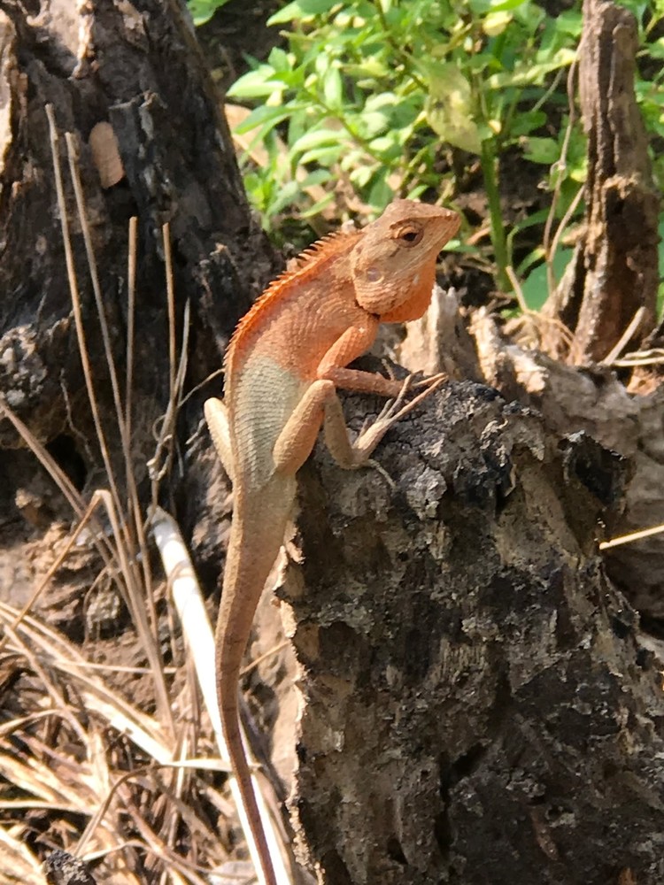 視覺畫面很豐富,民宿養了一些狗,十幾隻貓,還有很多雞。母雞窩著孵蛋,公雞則很認真的在練習飛上與我同高的樹梢啼叫,不用豢養的在地動物也很多,比如我爸早上發現了這樣斑斕的一隻蜥蜴,噢No,繼吳哥窟大蜥蜴後,東南亞叢林再度刷新了我的忍耐極限。