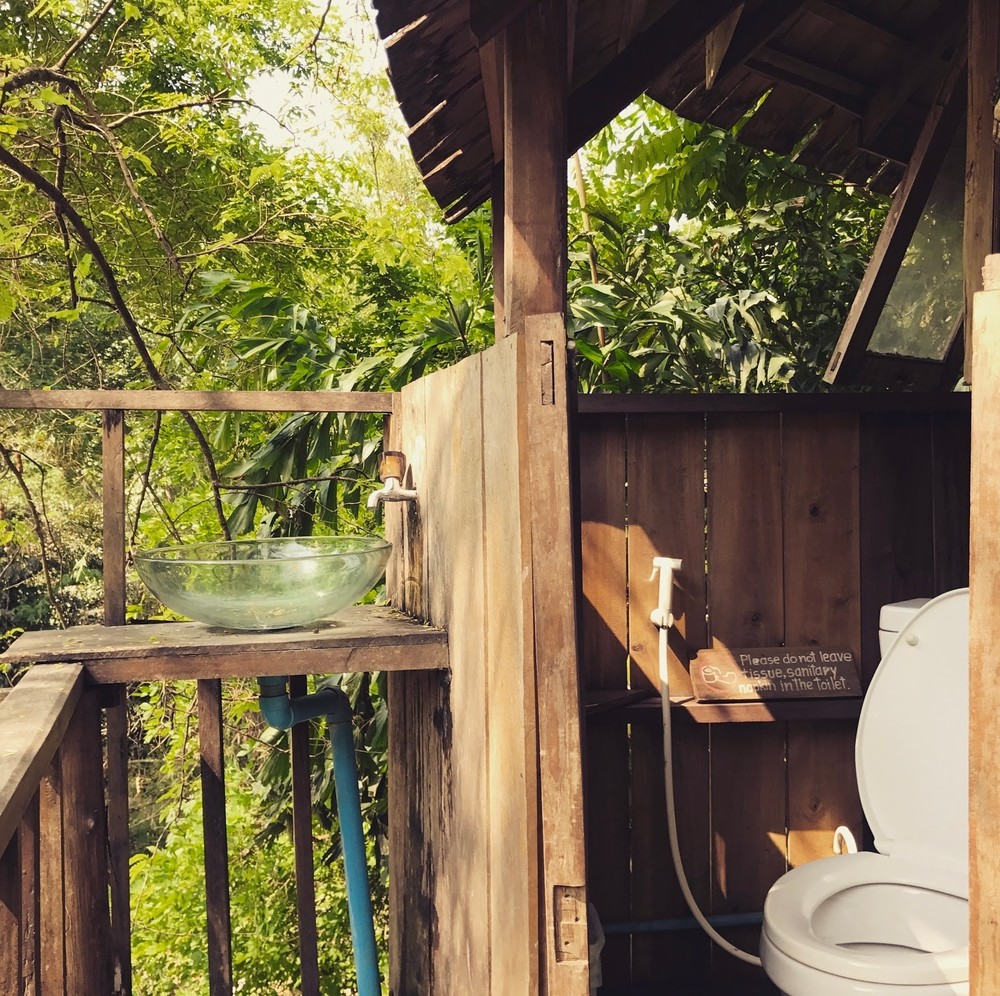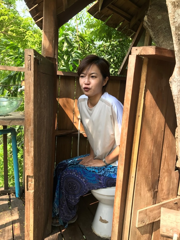 啊,我還在使用了樓上的「半露天廁所」。其實出門前我就有強迫自己先把肚子裡的存貨清空,但一親近大自然,我就忍不住地屎意滾滾…。在樹上如廁,起先很緊張,怕蟲,也怕沖不掉,但坐了一陣子,正對著綠蔭滿天,其實還滿愜意的。