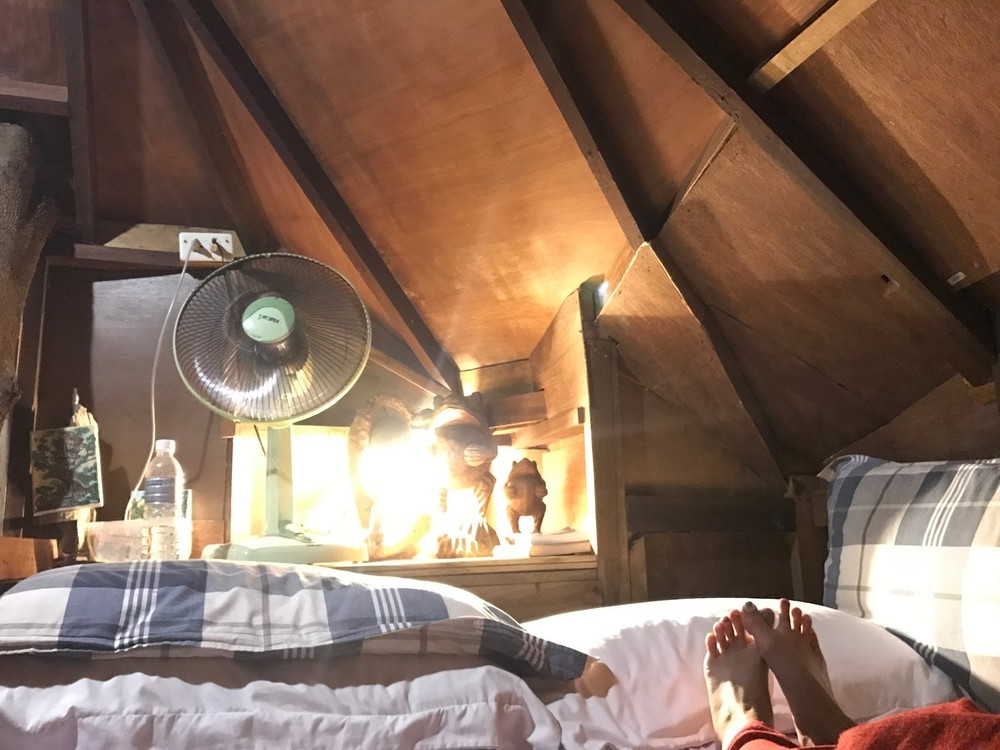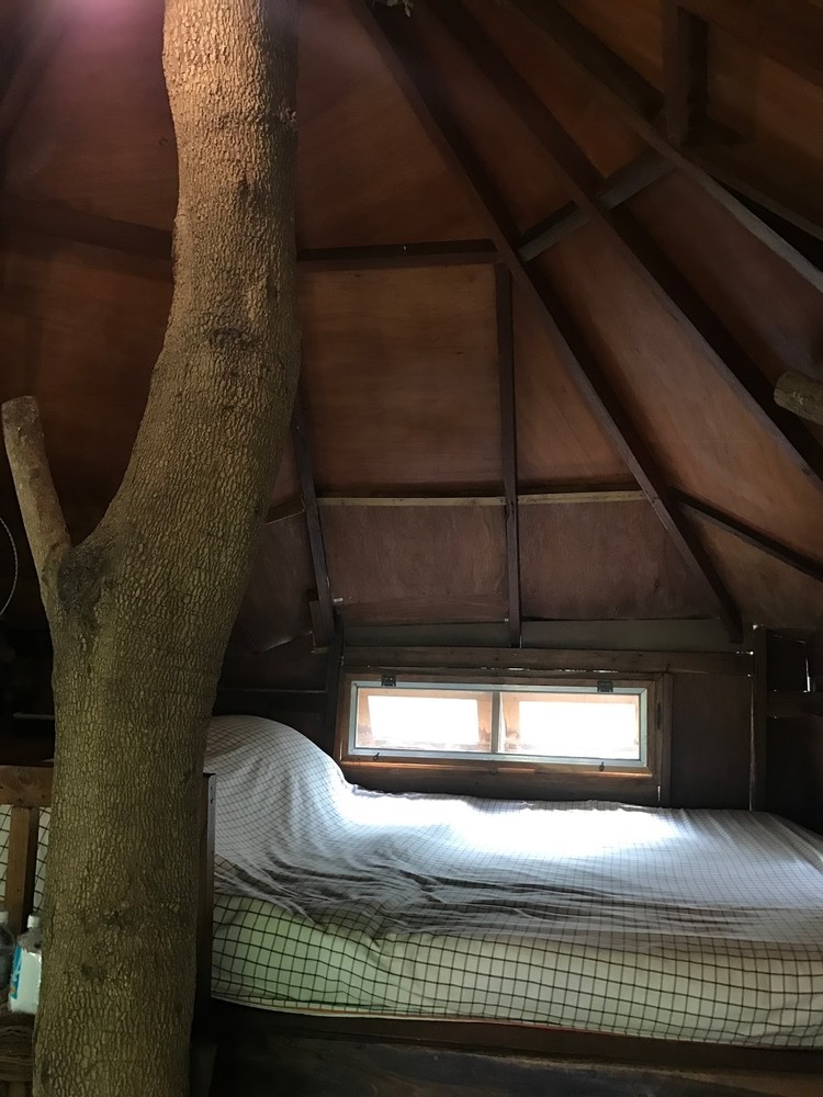 我們的小屋建在一棵枝葉茂密的羅望子樹上,這棵樹直直穿越了屋子的中心。屋內空間真的滿小的,放了一張雙人床,剩下的地板只夠我一個人躺著。