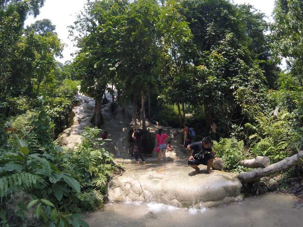 父女倆在下午一點準時回到民宿Check-Out,司機帶我們去一處名叫Bua Tong Waterfall的瀑布(另外付150塊泰銖)。爸爸不太玩水,但我自己很喜歡這裡,這裡的瀑布像是天然溜滑梯一樣,當地人自己串了繩索,真的可以滑來滑去,許多泰國人攜家帶眷在這裡野餐。