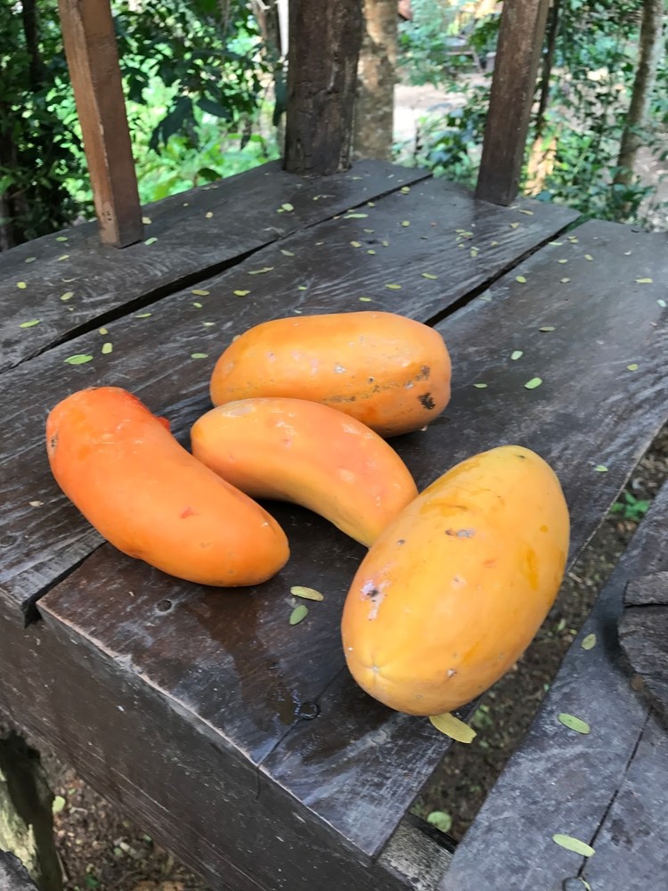 第二天早上八點,本人的爸爸已經過動到撿了一堆果園裡面掉落一地的木瓜。(他說很多木瓜都在地上爛掉了很可惜,所以愛物惜物的客家人如他,就算準背包裡的空間精準取貨)像許多媽媽溜小孩那樣,我也要來遛爸爸。騎著民宿免費提供的腳踏車到處晃晃。