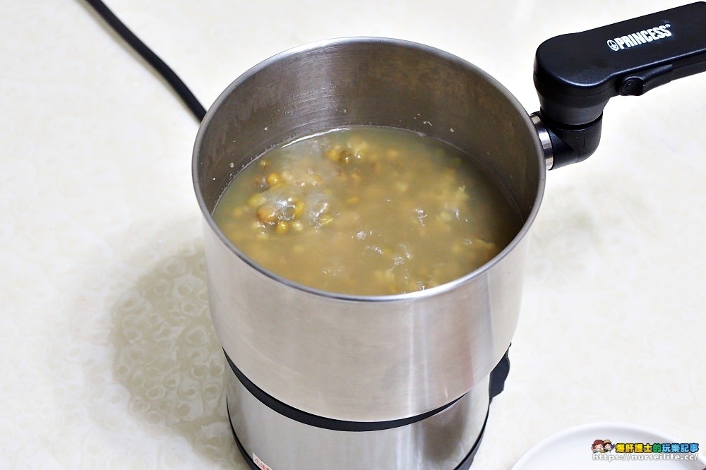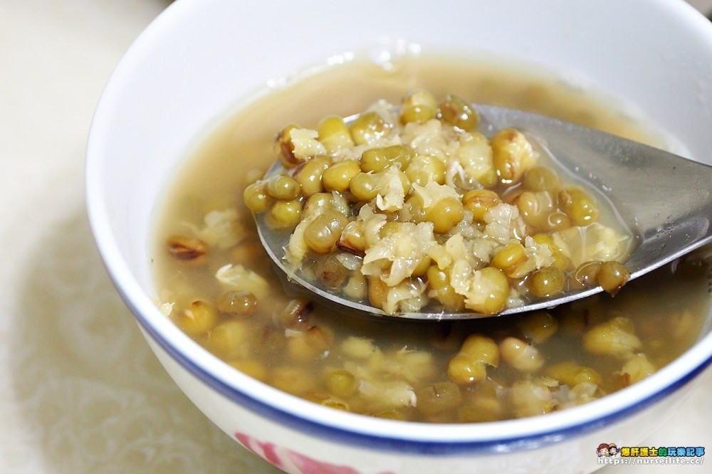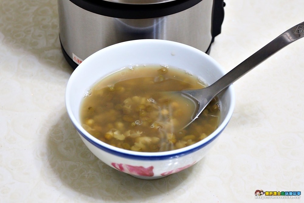 這真的根本沒有技術可言,就放著讓它慢慢煮,你就做你的事,只要水是在安全的標線內,它溫度到就會先跳停,所以也不用怕滾過頭會冒出來或乾燒,大概40分鐘左右,去看一下,綠豆都軟了,就放入糖,再煮個10分鐘就有綠豆湯可以喝了。