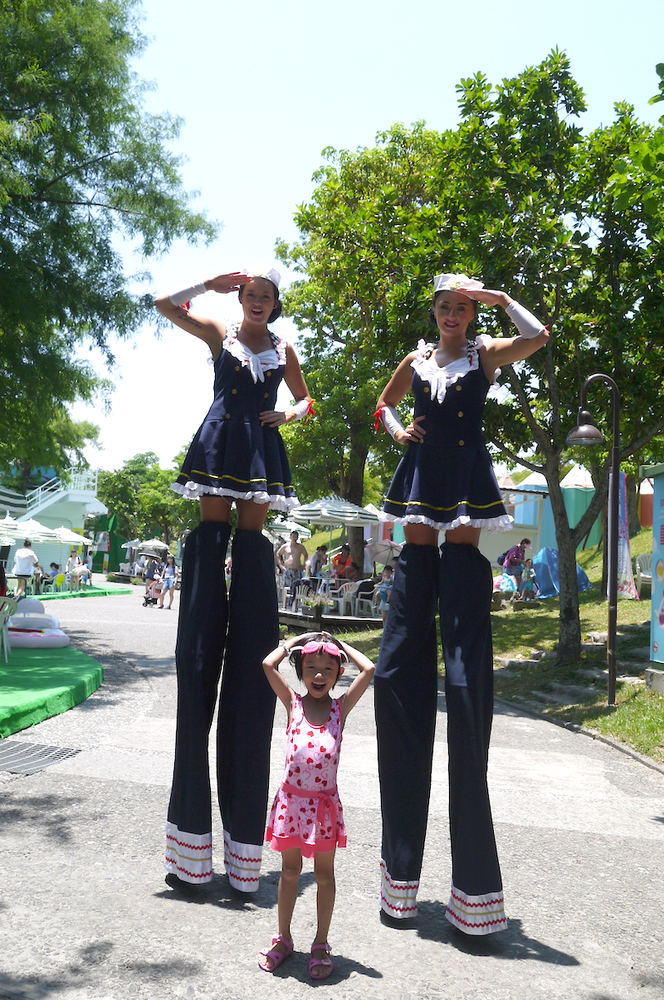 來自異國的美女踩著高蹺,讓小朋友覺得很興奮好玩。
