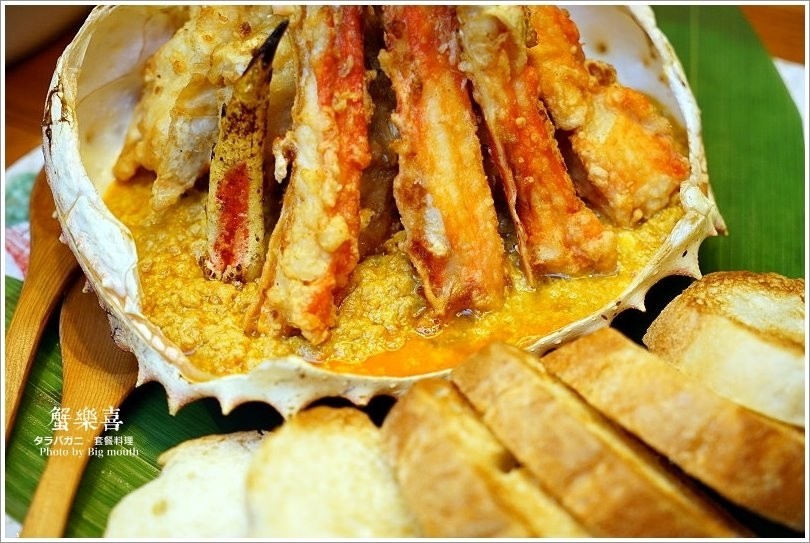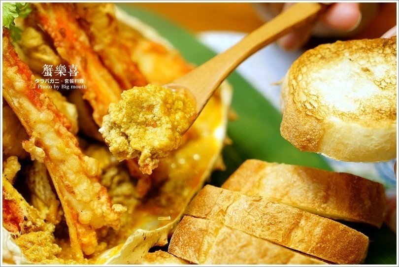 ▼南洋香辣蟹膏(附法國麵包),特別採用鱈場蟹的蟹殼為容器,裡頭盛裝的正是蟹膏搭配紅咖哩醬下去拌炒而成的精華,上頭的鱈場蟹經過酥炸完整保留鮮味與湯汁,一旁附上法國麵包可以搭配醬料享用,滋味多元又豐富!