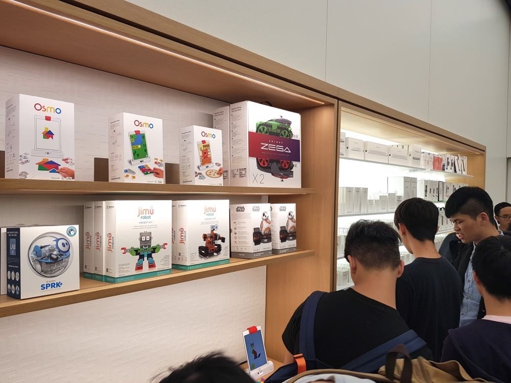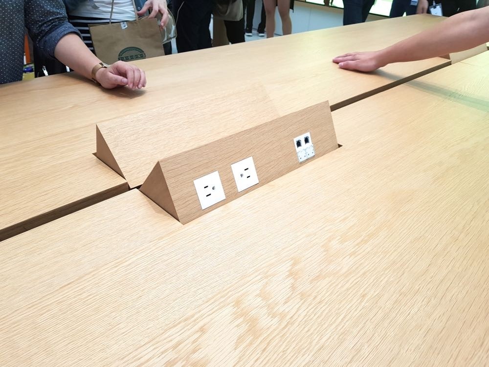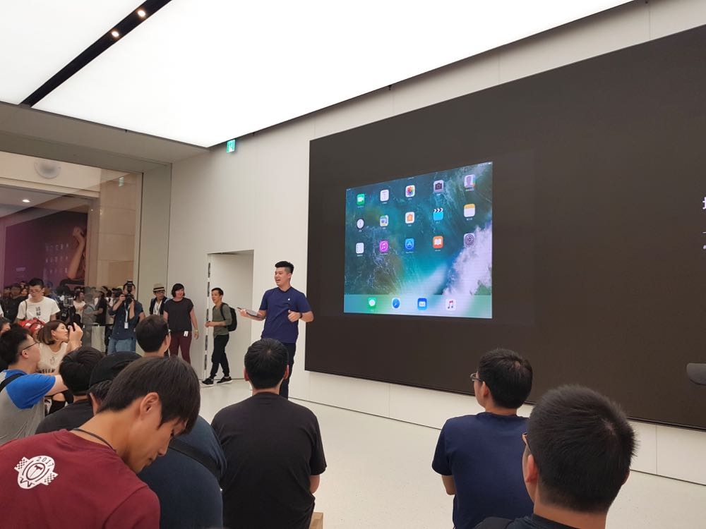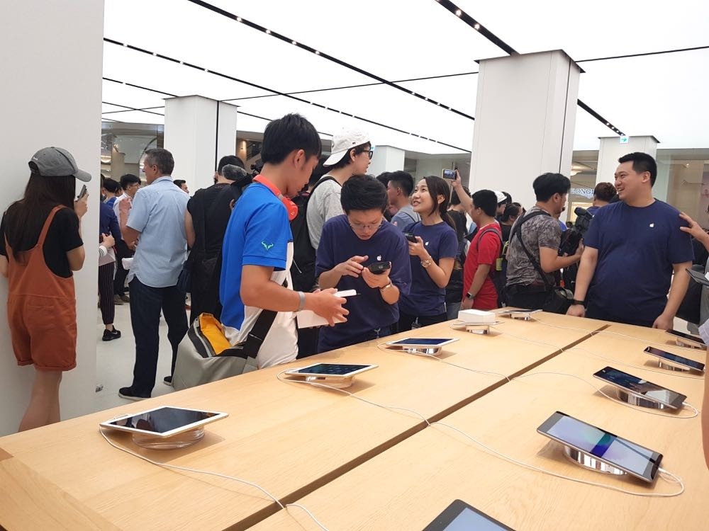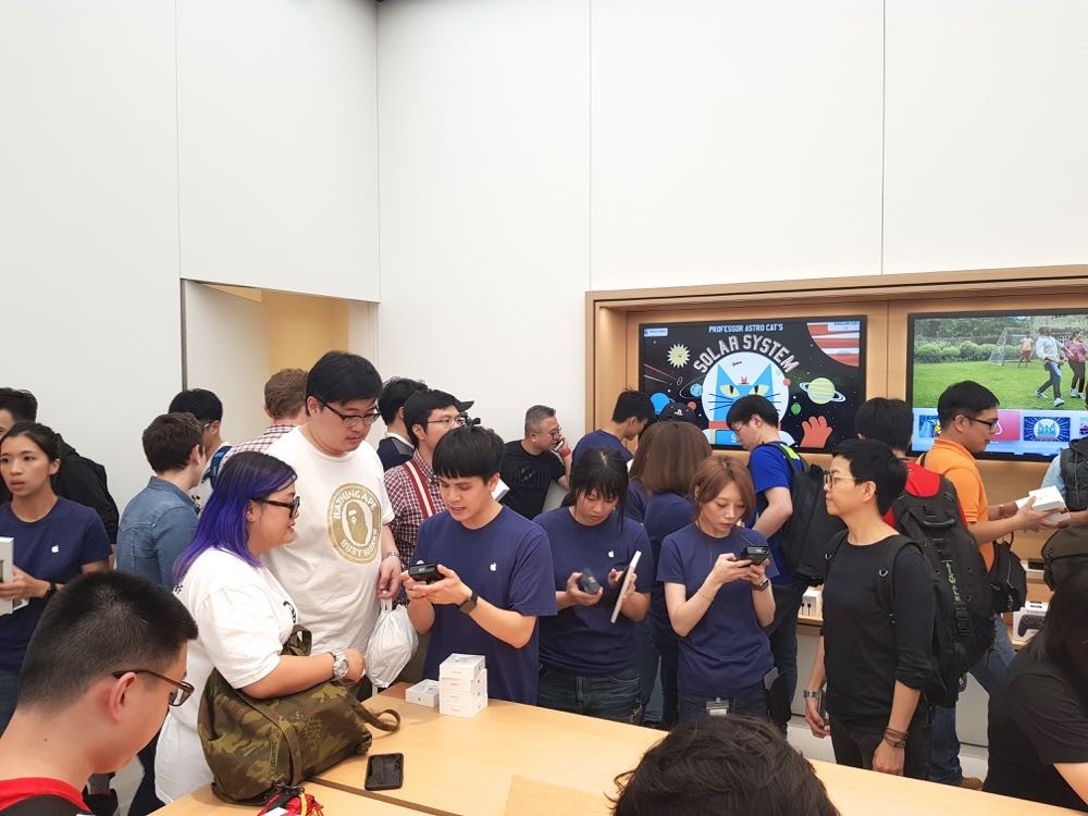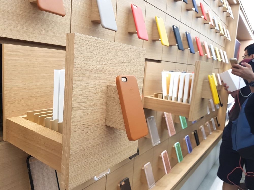 Apple 直營店中很快的便進入了滿滿的人潮,我們也可以看到利用手掌觸控來開闔的 Apple 招牌「Genius 桌」,以及新的保護殼陳列架。