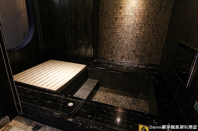 浴室空間非常大應該說比我家的房間還要大也很乾淨,以黑色磁磚深色石材為主,有種低調華麗的風格