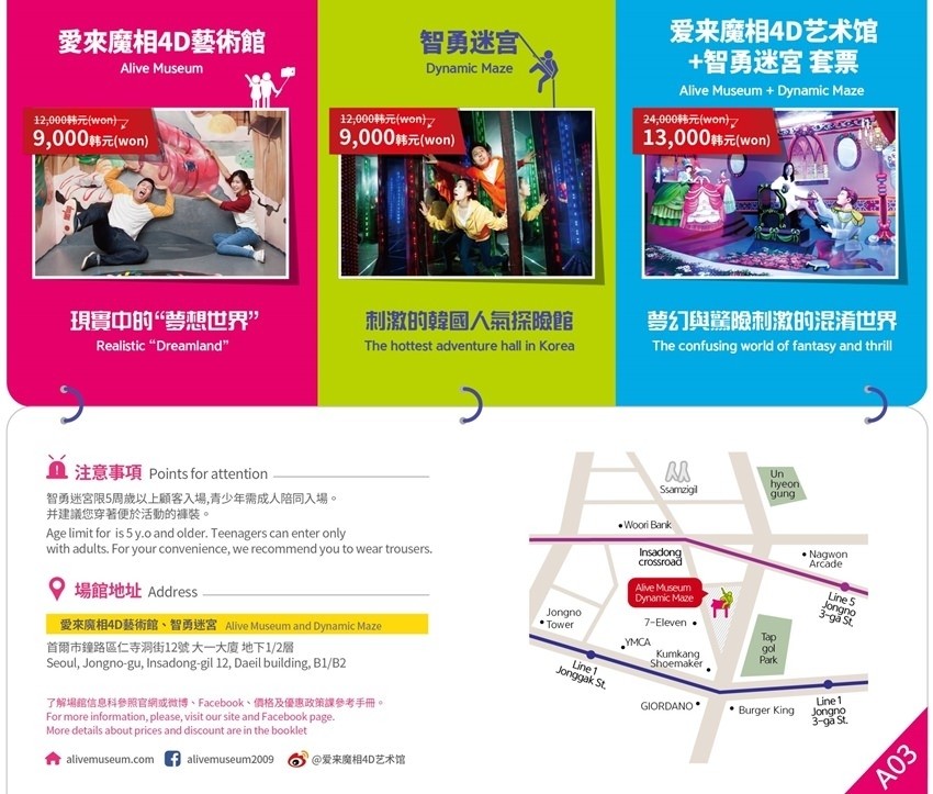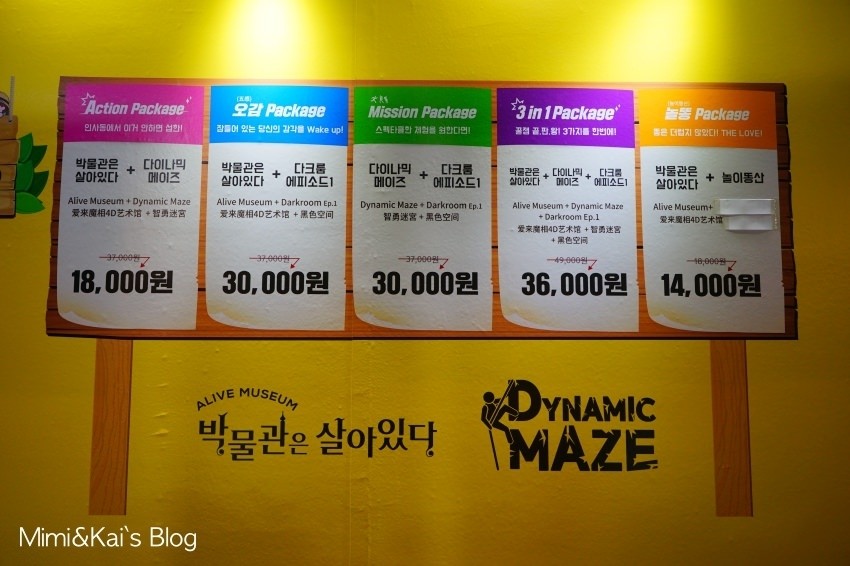 票價如上,我們今天玩的是愛來魔相4D藝術館、智勇迷宮,所以選擇18,000韓圓組合票比較划算,合台幣約500元左右。
