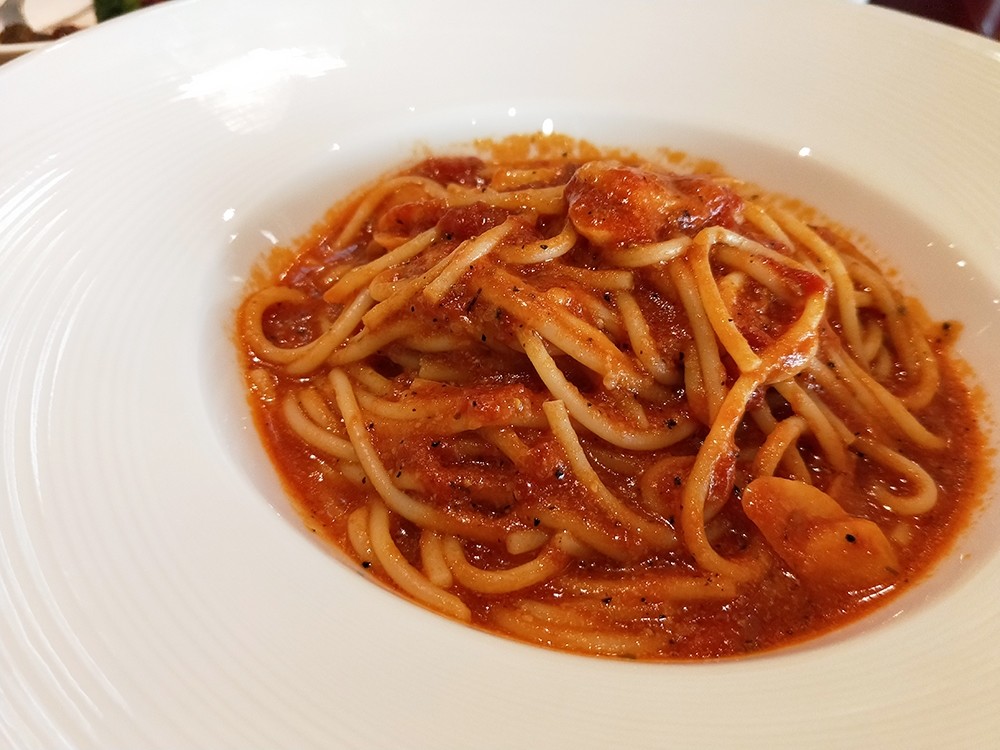 好了!不管她了,接著主食要來啦!也是我們家以前最常點的「蕃茄香蒜義大利麵」,這個口味真的是吃不膩來著,醬料很有香氣,連丈母娘都問服務生有沒有單賣那個醬的~