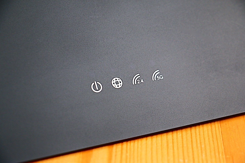 在路由器的面板上方,僅有簡單的四個燈號,由左至右分別是電源指示燈、網路線連接訊號、2.4GHz Wi-Fi 訊號燈、5GHz Wi-Fi 訊號燈。