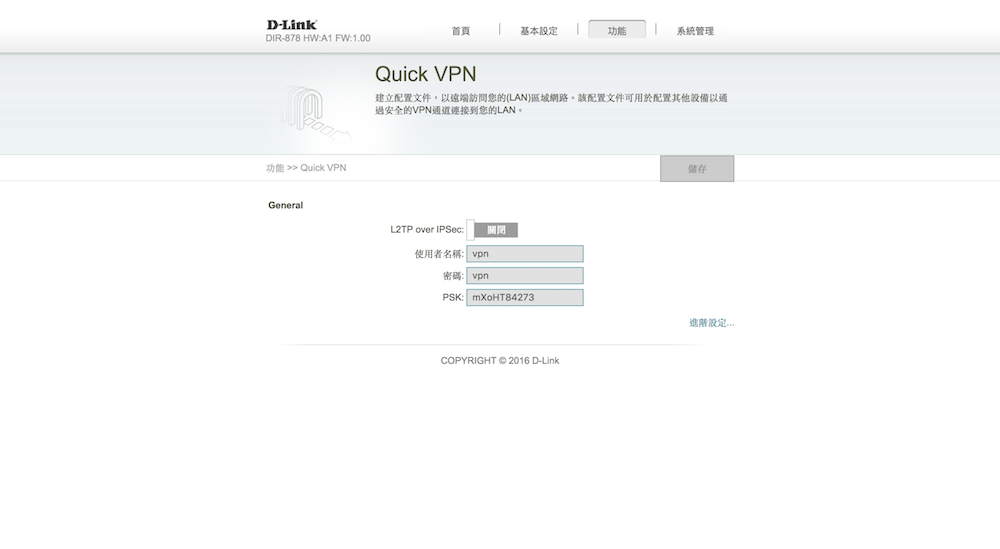 AC1900 DIR-878 內建 VPN Server,若需要在辦公室或家中建立一個類似點對點的私人連線方式,讓數台電腦能透過共享或公用網路互相傳送資料,可以從設定頁面中建立 VPN 虛擬私有網路,建立完成後就算人不在辦公室或是家中,也可以連上虛擬私有網路或是企業網路來進行檔案傳送或辦公。