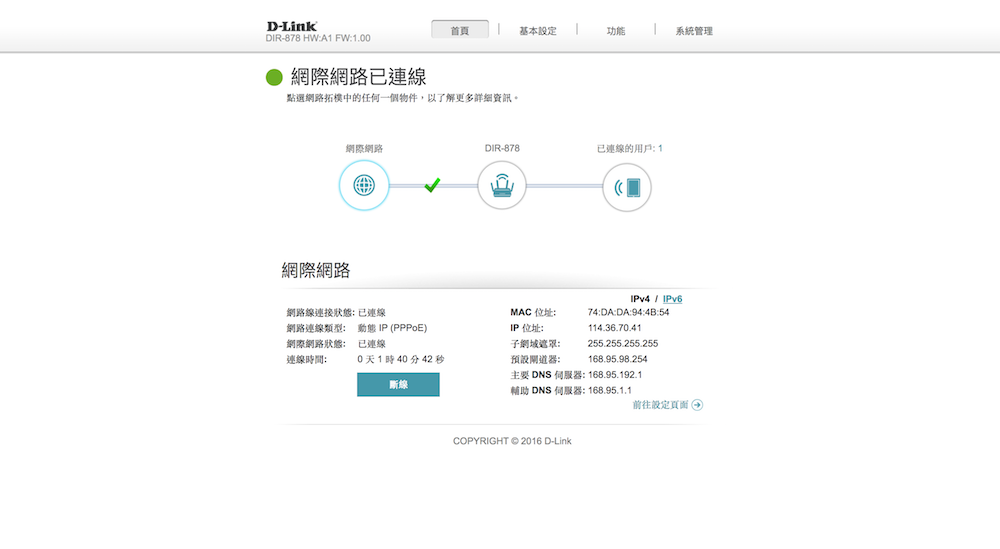 在 AC1900 DIR-878 的設定頁面中,不僅能看到目前的網路連線狀態,也可以透過此設定頁面來進行各種連線與功能設定,讓用戶能輕鬆掌握路由器現在的狀態,以及防火牆…等各種權限是否正常運作。