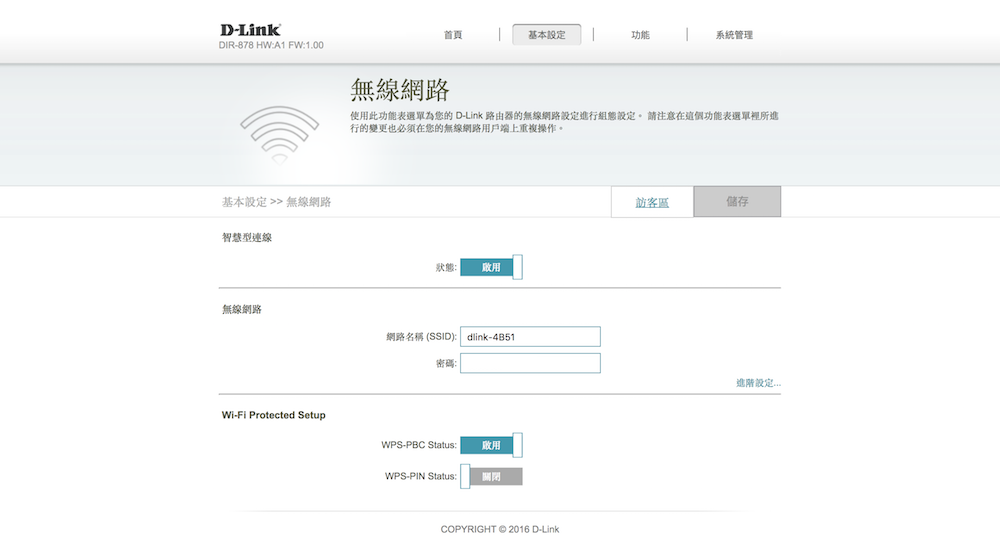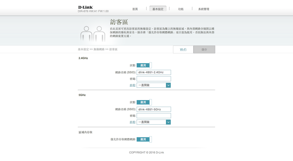 當 AC1900 DIR-878 與家中的數據機連線後,可從基本設定中來新增 2.4GHz 或 5GHz 的網路設定,不管是網路名稱、密碼或是排程,都可以任意操作。