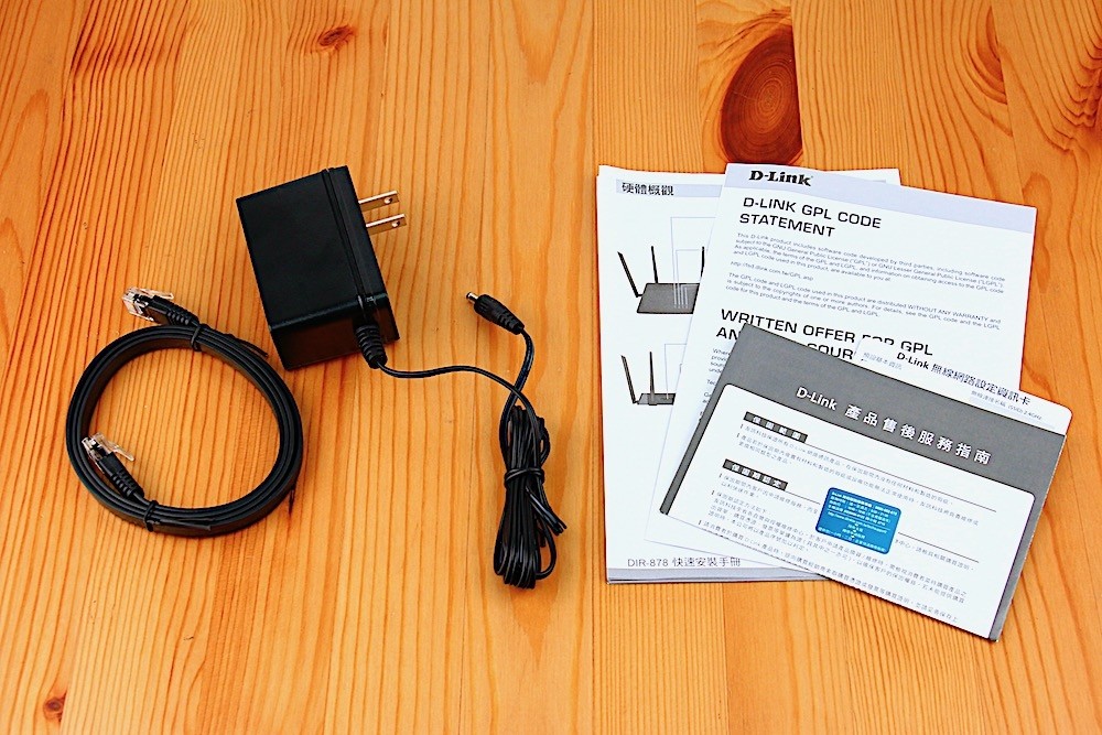 盒裝內除了路由器本體之外,還有產品售後服務指南與使用說明數份、AC 110V 轉 DC 12V 電源線乙條、網路線乙條。