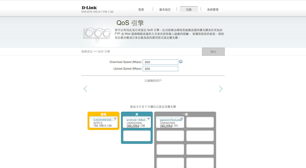 在家玩線上遊戲時,最怕的就是多個裝置同時上網,把原有的網路速度瓜分掉,導致遊戲連線品質不佳的狀況發生。為了避免這樣的狀況影響玩家在遊戲中的表現,AC1900 DIR-878 內建 QoS 引擎功能,只要透過拖拉的方式,將正在玩線上遊戲的裝置設為最高優先權,其他閒置或是瀏覽網頁的裝置設為一般,就能讓所有已連線的裝置分配到各自所需的網路速度。