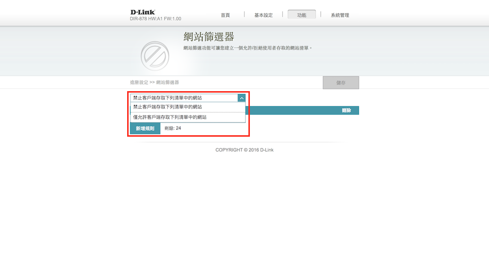 為了讓公司主管或是家長們限制同事或孩童瀏覽部分網站,AC1900 DIR-878 也具備了網站篩選器功能,只要將特定網站登錄網站篩選器中,就能阻擋接收 AC1900 DIR-878 無線訊號的裝置瀏覽不正當的網頁。此外,設定頁面中還提供上網時間的限制,可有效避免家中孩童過度使用電腦,保障孩童視力或是課業上的表現。