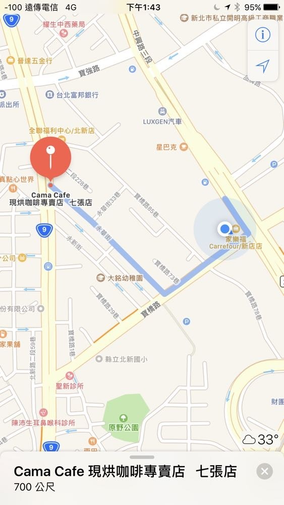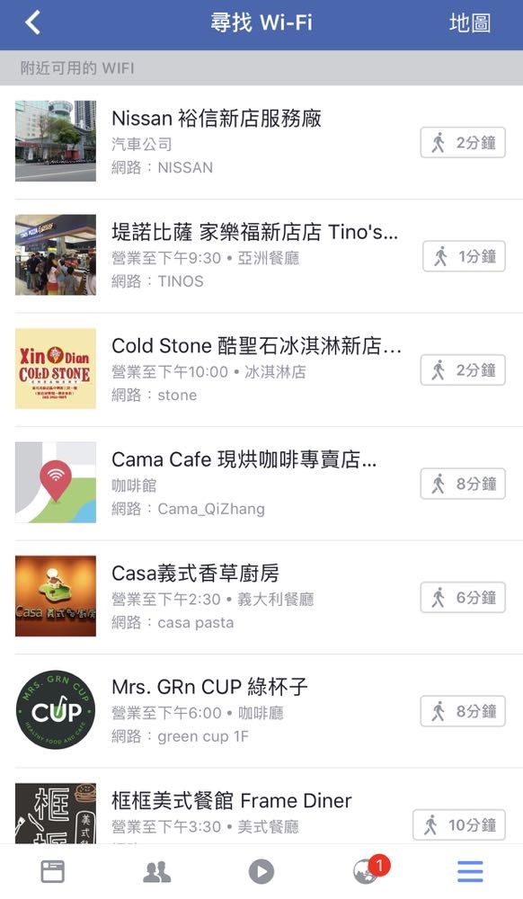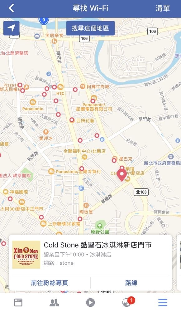 只要點進去「尋找 Wi-Fi」,我們可以看到 Facebook 會以我們目前的位置進行定位後,再顯示附近有提供 Wi-Fi 的店家資訊。點進有興趣的店家,還能進一步的提供 Facebook 粉絲頁資訊 (不愧是 Facebook 地主優勢) 與進行路線規劃!