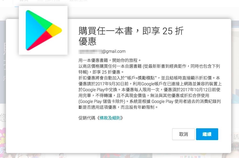根據實際購買後發現,用戶直接點選 Google Play 商店的「圖書」 就會看到上方出現 25 折優惠的圖示,點進去確認你的帳戶,並且按下「繼續」就能開始挑選書籍。