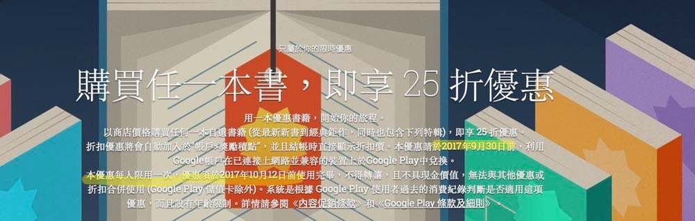 愛看書的朋友快點把握這難得的機會!Google Play 推出限時 25 折的優惠折扣,用戶只要在 9 月 30 日前至 Google Play 商店的「圖書」,點進 25 折優惠中領取專屬的折扣,便能開始挑書!