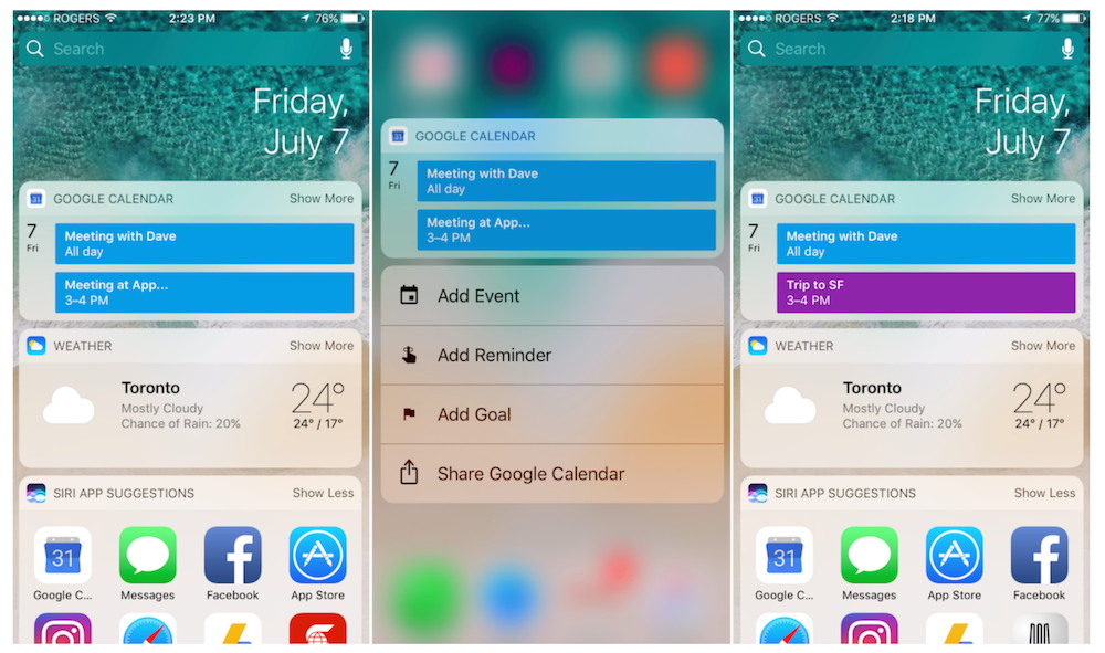 當 Google 日曆更新到 2.4.0 版本後,用戶即可透過 iPhone 的 Widget 頁面下的「編輯」功能加入 Google 日曆的 Widget 小工具,新增完成後,就能在 iOS 的 Widget 頁面中看到最多 2 筆的行程顯示。此外,這波 Google 日曆的版本更新中還針對 iPhone 6s/6s Plus、iPhone 7/7 Plus 四款具備 3D Touch 功能的手機加入了快速瀏覽近期 2 筆待辦事項以及新增活動、提醒,讓用戶能精準的掌握未來行程、待辦事項。