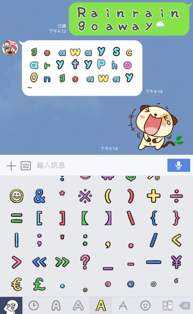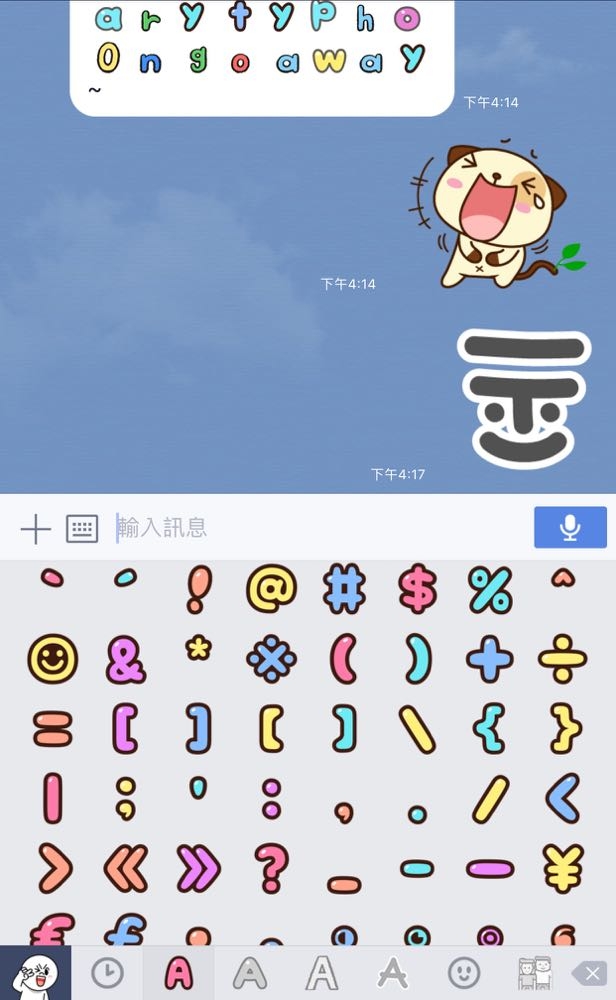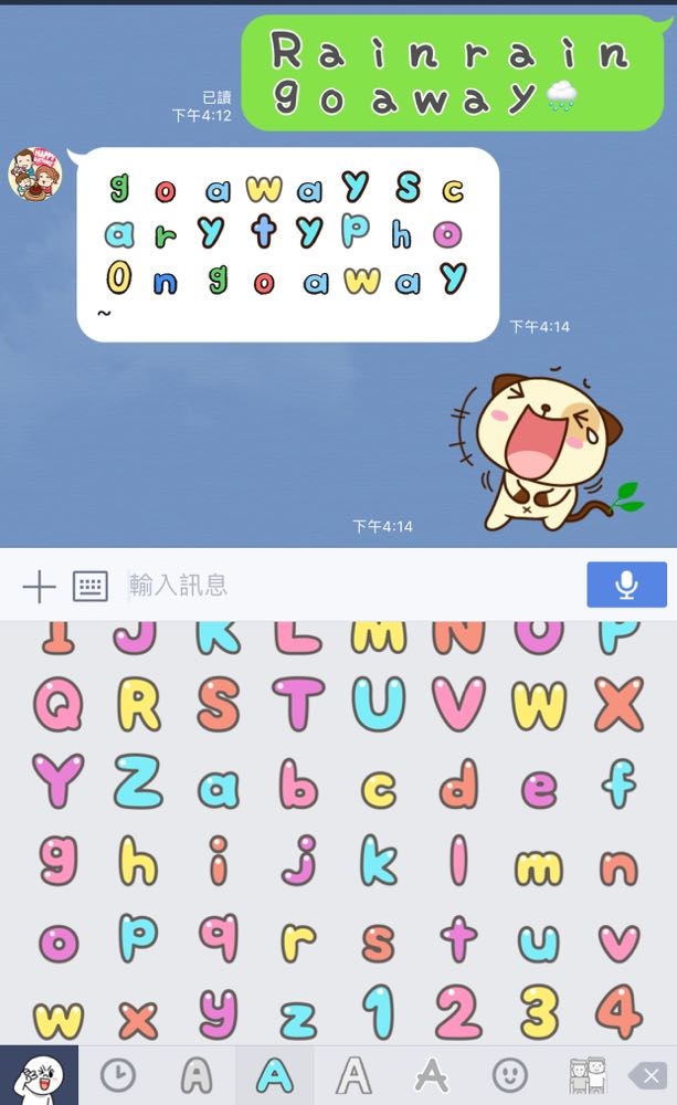 LINE 的用戶只要更新到新版的 LINE 之後就能發現,只要在輸入時輸入英文或是標點符號,系統便會出現多種超可愛字體選擇。而且除了在打字的時候用被動的方式來挑選,我們還可以直接點選鍵盤下方的貼圖,選擇笑臉的灰色符號,就能看見旁邊出現了四種不同的字體提供選擇。