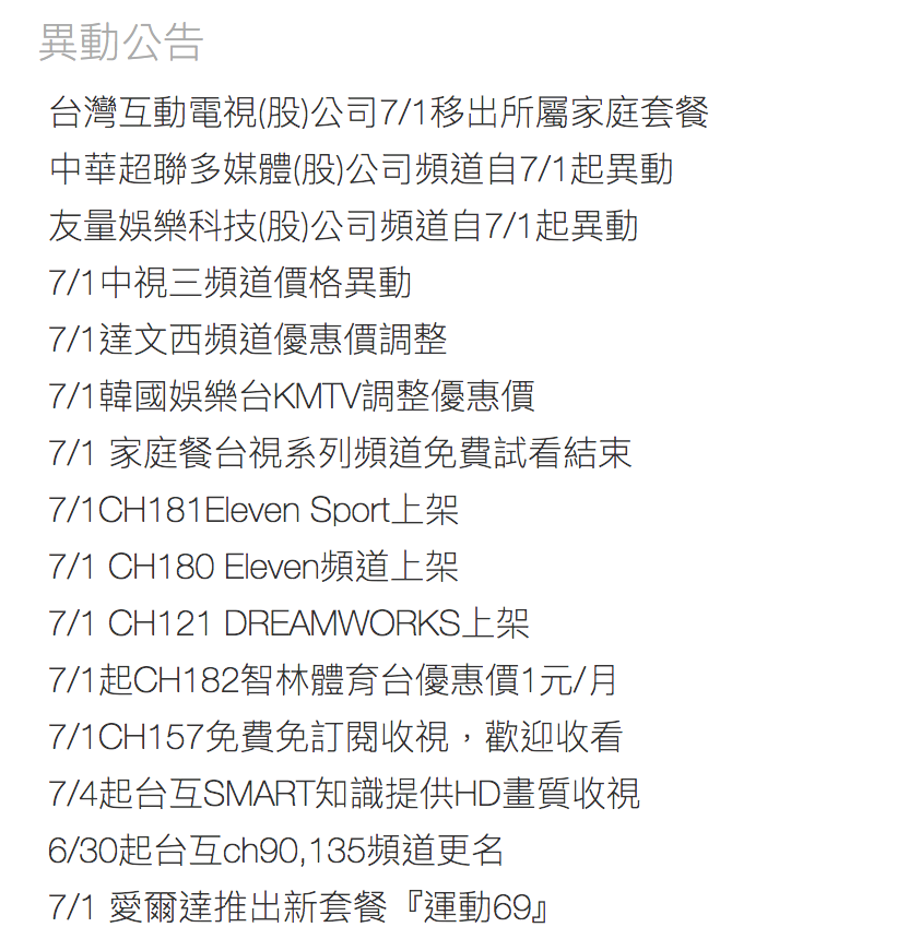 原來根據中華電信 MOD 官方的異動公告,我們發現這次影響最大的便是擁有 45 個頻道的台灣互動電視決定移出豪華套餐服務,台灣互動公司旗下包括了