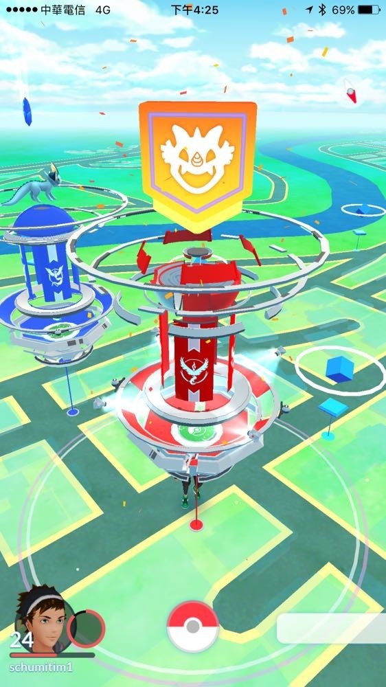 而抓到後也可以看到剛剛的道館出現了特殊的符號,這也表示不能再進去打。不過沒有關係… 這樣已經很好 (滿足微笑)!