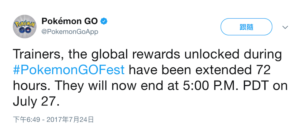 為了回饋全球玩家的熱情支持,稍早 Pokémon GO 官方 Twitter 上公布了一則貼文,表示原本只有 48 小時的 Pokemon GO Fest 神獸捕捉活動確定加班,將另外增加 72 小時的活動時間,若在前面的 48 小時活動中尚未捕捉到洛奇亞、急凍鳥這兩隻神獸級的寶可夢,可要多加利用後面延長的 3 天活動時間捕捉。