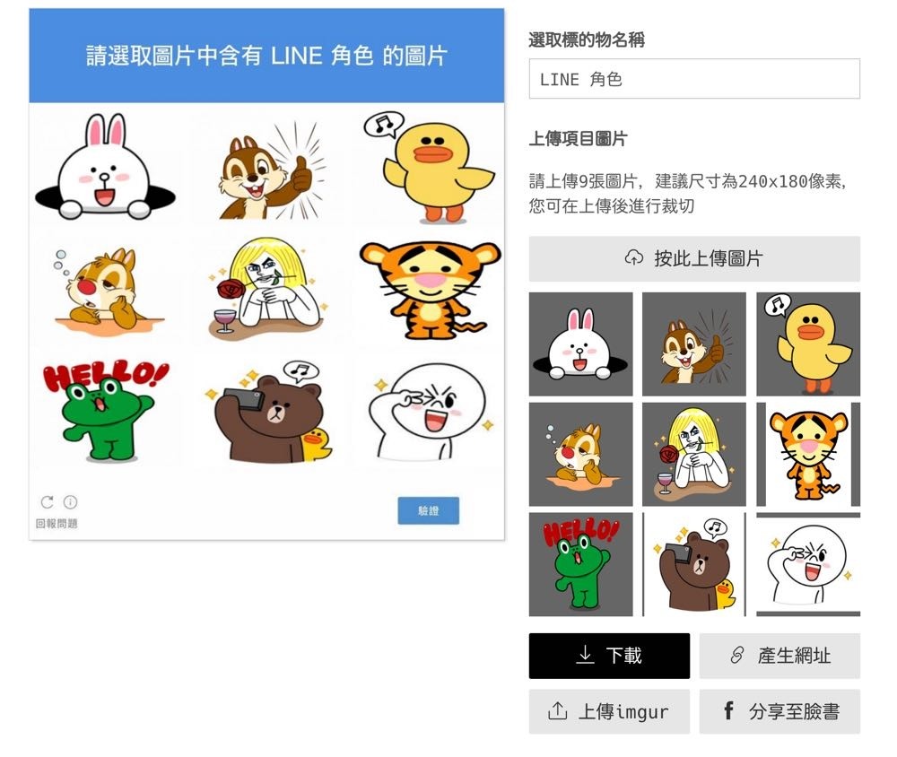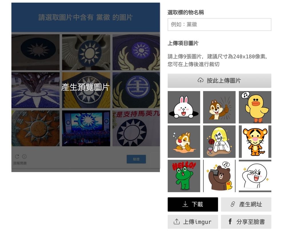 等到上傳完成按下「產生預覽圖片」就會看見剛剛我們選的 9 張圖片已經出現成驗證圖片。