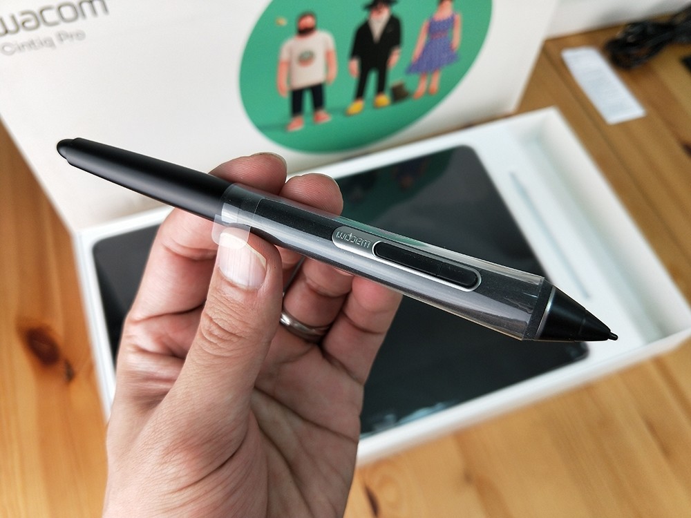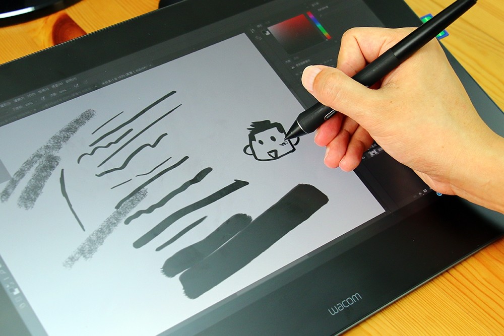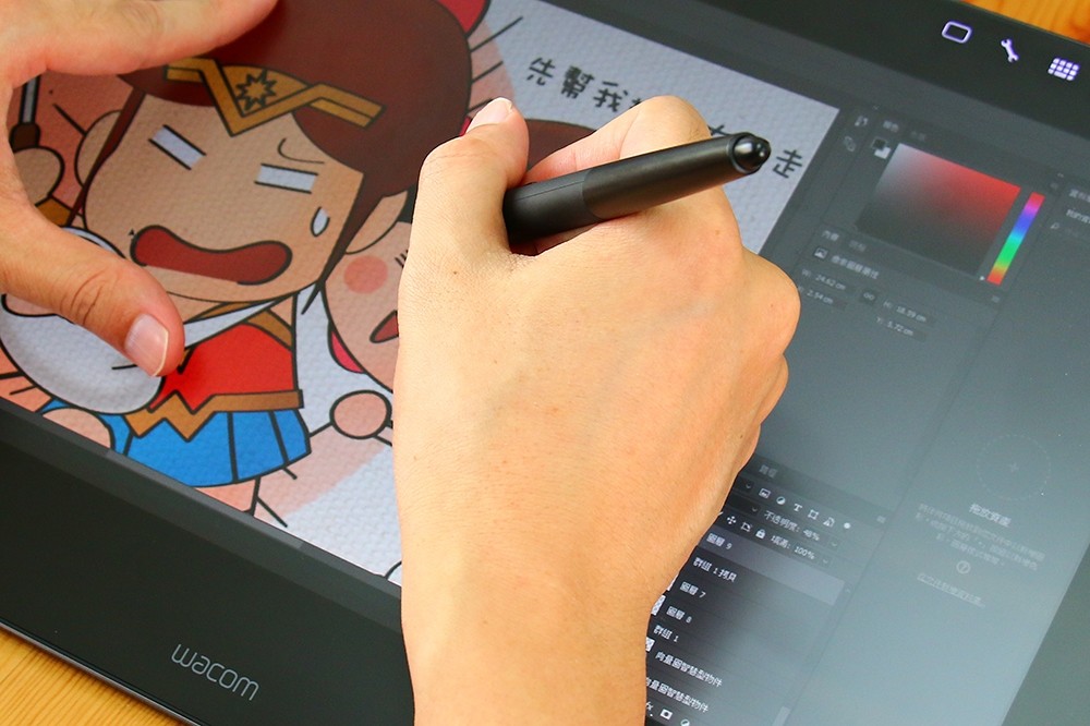 不得不提一下他們家全新的 Wacom Pro Pen 2,整個準確度和反應能力都很好,畫下去你就知道了,完全沒有延遲感,而且平常你習慣手稍微自然傾斜的角度,在這裡完全沒問題,筆觸在螢幕玻璃上的磨擦也很剛好,算是有非常好的控制能力,而且輕巧又不用裝電池,我覺得是很稱職的小幫手!